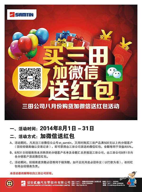 1、Activity time:2014-8-l- 2014-8-31 2、Activities: Plus WeChat to send a red envelope